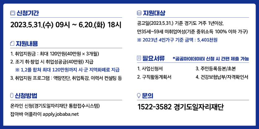 - 경기도일자리재단(경기여성 취업지원금 사업) 콜센터 : ☎ 1522-3582 (평일 09:00 ~ 18:00, 점심시간 12:00~13:00 제외)
