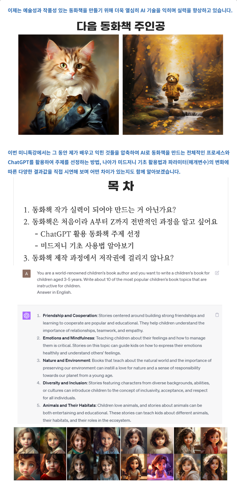 이 강의는 AI 동화책 제작의 전체적인 프로세스를 다루며,