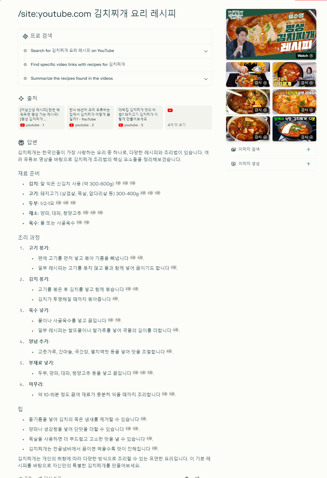 설명: youtube.com에서 김치찌개 요리 레시피 관련 정보를 검색할 수 있음