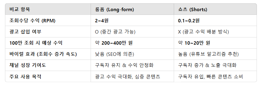 ✔ 롱폼 vs 쇼츠 수익 비교 – 요청한 블로그 내용을 바탕으로 분석