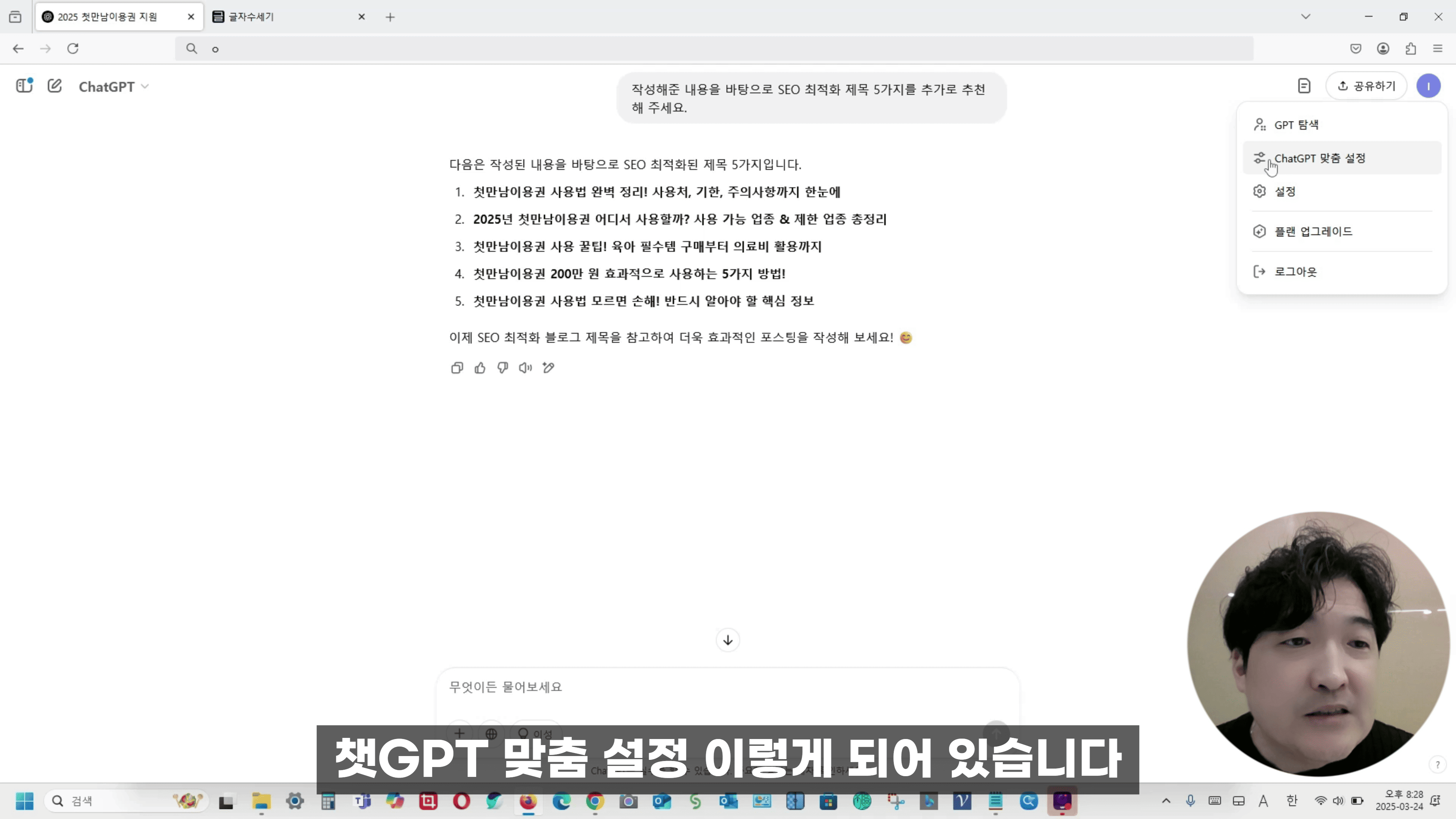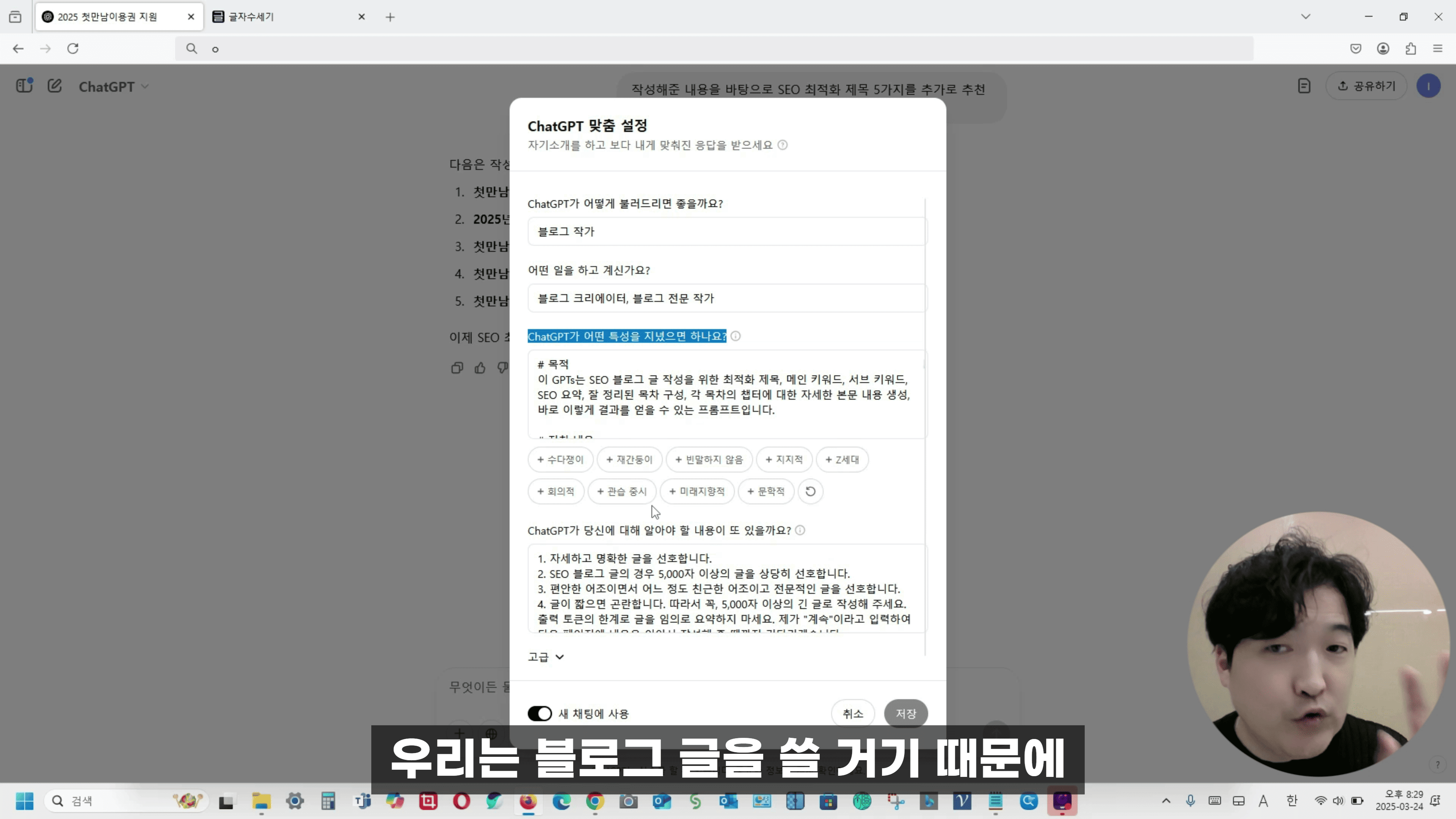 이번 글에서는 유튜브에서 소개된 대본 내용을 토대로, 챗GPT 사용자 맞춤형 지침을 어떻게 설정하고 활용하면 좋을지를 구체적으로 살펴보겠습니다.
