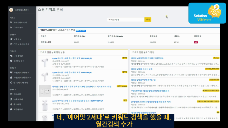 상품의 판매량, 리뷰, 사용된 키워드, 가격, 다양한 상품에 상세정보, 이런 부분을 한눈에 보실 수 있다는 장점