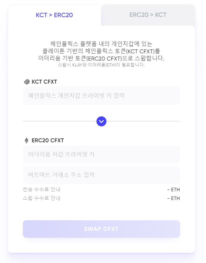 반대로 ERC20 CFXT에서 KCT CFXT 스왑을 지원하고 있습니다.