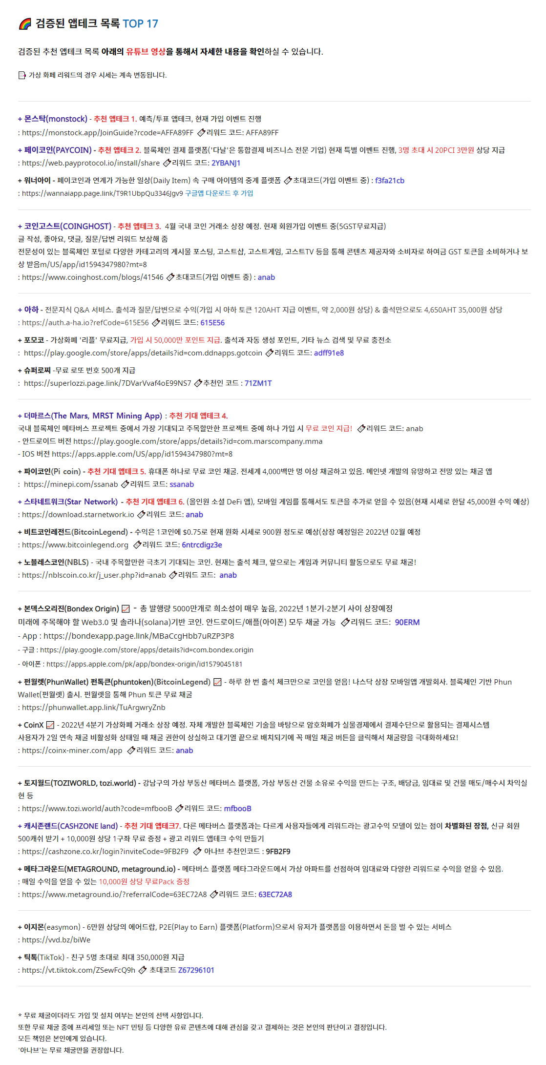 | 전망있는 무료 코인 채굴 앱테크 추천 목록 BEST 5(더마르스,스타네트워크,노블레스코인,비트코인레전드,파이코인) (1) | 2022.02.24 |