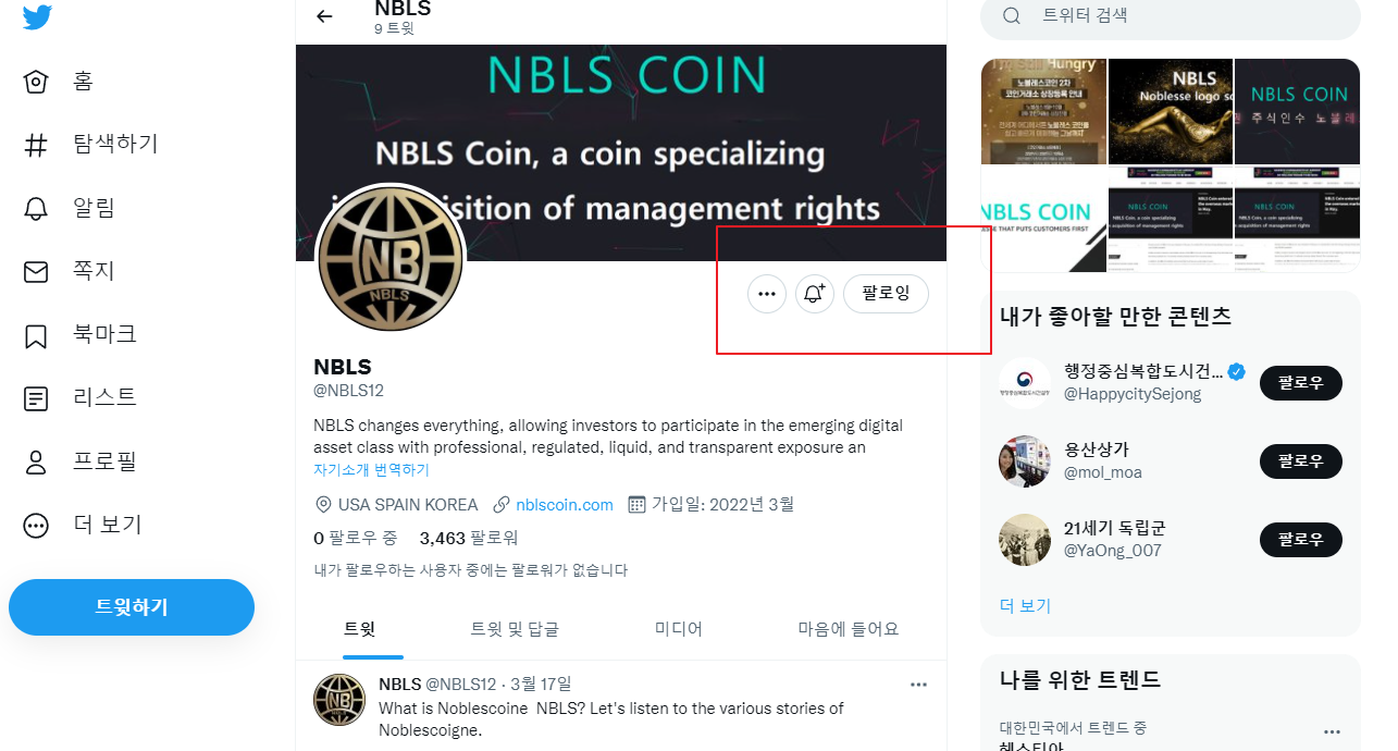 영어 버전 노블레스 코인 팔로워 공식 계정 주소 https://twitter.com/NBLS12
