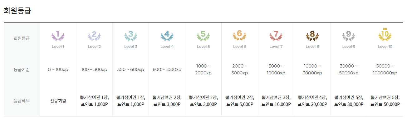 포인트도 레벨 1등급 1,000포인트 지급, 10등급은 50,000포인트를 지급합니다.