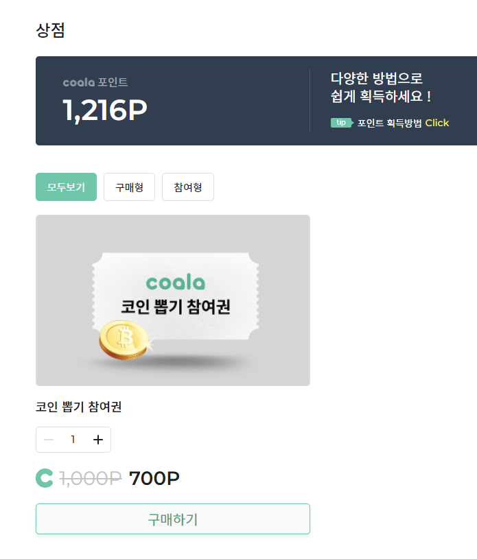 '상점' 메뉴에서 코알라 포인트 700포인트로 참여권 구매가 가능합니다