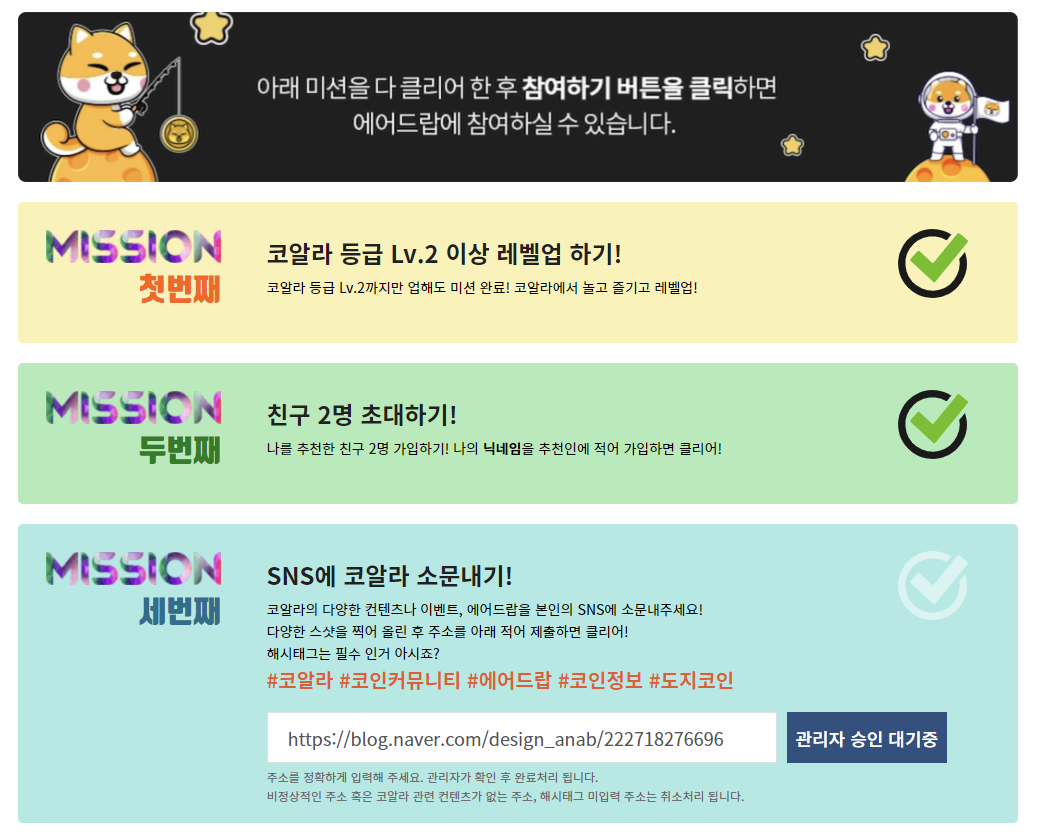 에어드랍 이벤트 신청 방법은 3가지 미션을 진행하면 됩니다.