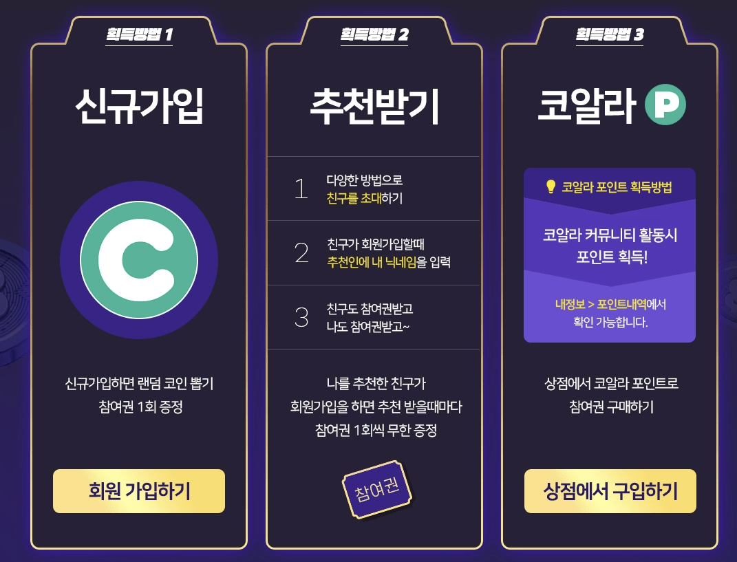 코인뽑기 참여권을 획득하는 방법은 3가지가 있습니다.