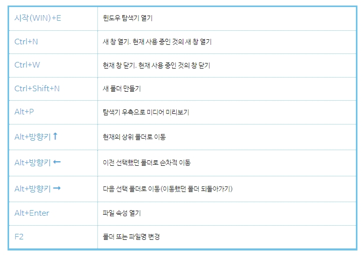 | Alt+방향키 ⭡ | 현재의 상위 폴더로 이동 |